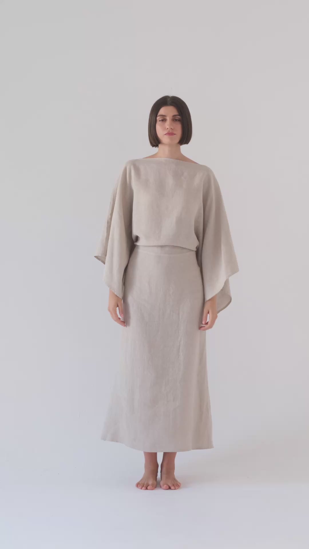 The Kimonos Dress is defined by its dramatic sleeves and adjustable self-tie, allowing you to tailor the fit and styling to your own silhouette. Its extremely versatile design flatters a wide range of body shapes, draping fluidly while cinching gracefully where you choose. Crafted from 100% linen, then garment dyed and stone washed, the fabric reveals subtly faded tones and an exceptionally soft hand, lending the piece a lived-in character with refined ease. Effortless yet striking, this dress balances comfort, versatility, and modern sophistication.